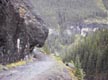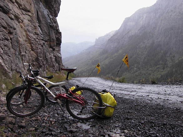 At one point, I remember gazing across the gorge and being amazed at how beautiful everything was, as we sat snuggled under our space blanket under a rock overhang. Brilliant green vegetation clung to cracks and ledges on a 500-foot high cliff face across the gorge. Stone, black and shiny with moisture rose up to meet dark green slopes of Englemann Spruce and grassy avalanche runs, topped by gray talus slopes leading up to high summits. Misty rain slanted down into the bottom of the canyon where a brilliant white cascade thundered. I felt like I could sit there forever. Heck, anything to get out of having to peddle up a 20-degree pitch pulling a loaded trailer! People would splash by us in jeeps, peering at us curiously and sympathetically through water and mud specked windows. I could imagine them thinking about how miserable we looked, while I was wondering at how paradoxically happy I was.