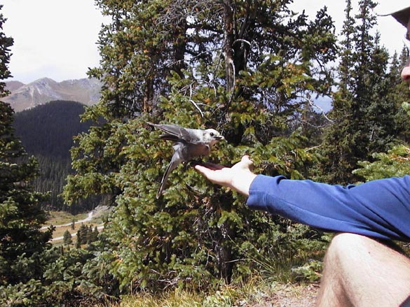 We stopped for a quick lunch overlooking a small mining ghost town, and were visited by a very tame gray jay, who would land on my hand and head to eat crumbs.