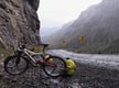 As a light rain began to fall, we stopped for a quick snack and to discuss our situation. We had pushed ourselves really hard to reach this point and were definitely starting to slow down. We figured that it would take us at least an hour and perhaps more to drag our bikes up and over the top, with several sections requiring that we combine our efforts on one bike at a time. The clouds coming over the ridge were looking darker and darker, and it was impossible to tell if thunderheads were building above the lower clouds that we could see. We were well above tree line and there weren’t any sheltered places to pitch a tent that would have been safe during a thunderstorm. We both decided that we would feel really stupid if we pushed on in uncertain conditions and one of us got struck by lightning on top of the 13,000 foot high pass. Opting for safety over desire, we hopped onto the bikes and headed back down the way we had come, towards the trees. As we did so, it began to hail.