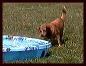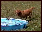 Dingo's not real sure about the big pool, as much as she wants the ball, she rather