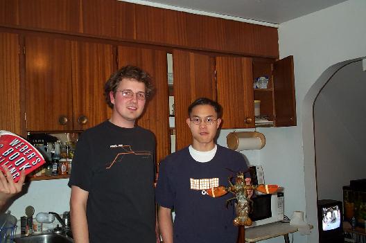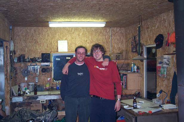 Partying in Latch's garage - Marc looking into the camera on the left and Kurtis playing the guitar.