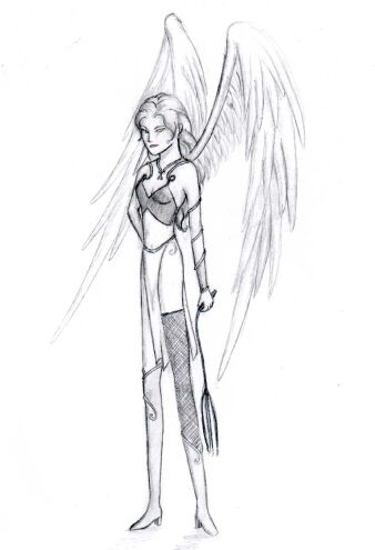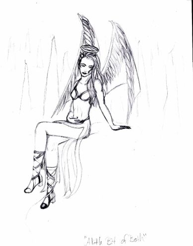This is sort of a "Self portrait" I drew. I asked my Boyfriend once if he thought if I was an Angel or a Devil and he said that girls were a little bit of both. I decided to go with combining the wings as opposed to one Angel and one Leather wing. I Drew it off a picture of myself for the body position too.