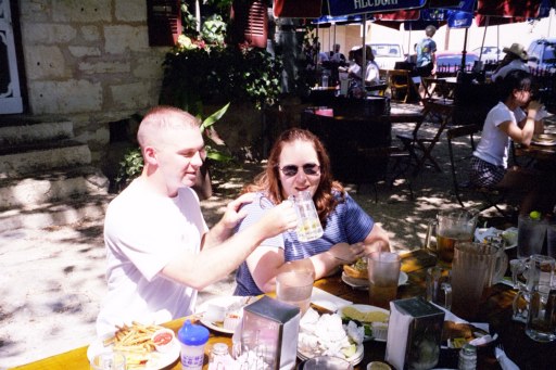 ![]() Oly & Bob on his last night in San Antonio, downtown under Jim's-on-a-stick,