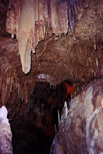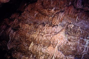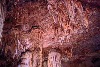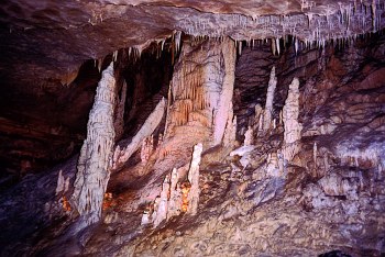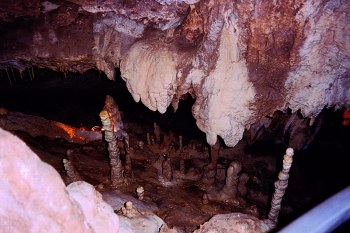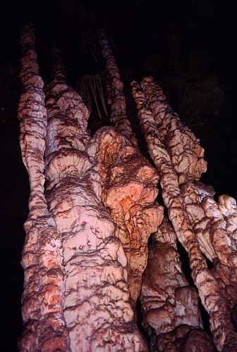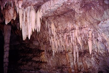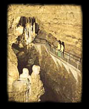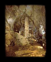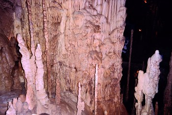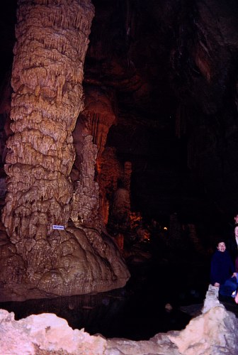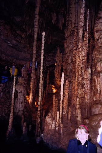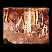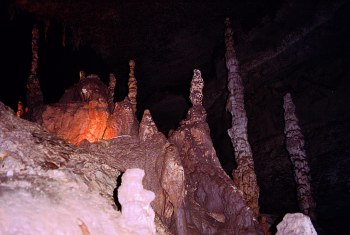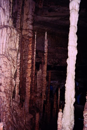 You are now 180 feet below the surface. Sherwood Forest is named for the tall stalagmites, flow stone and columns that resemble trees. These formations are unique because they are unusually slender for their height. Some are only a few inches in diameter.