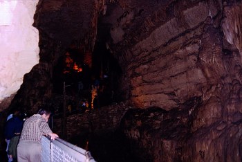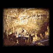 This room is the second largest room on your tour today. It is 50 feet wide, 50 feet high, and 250 feet long. The Castle of the White Giants contains the largest formations in Natural Bridge Caverns. The spectacular column called the Watchtower spans the 50 foot height of the room. The Mount of the Landlord is the largest stalagmite in the caverns. The King's Throne resembles a huge ornate chair draped with curtains. Beautiful formations called chandeliers hang from the ceilings and walls of this room. The crystal clear water you see in the pools here appears to be green due to light refraction beneath the surface of the water. .