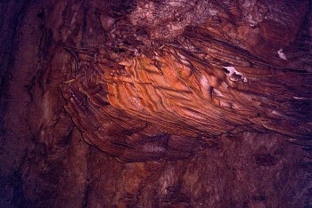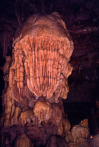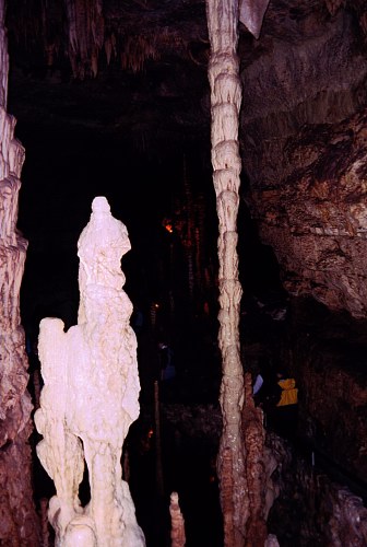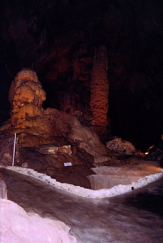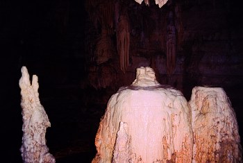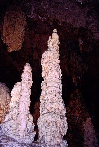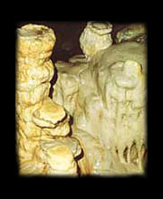 Water had to drip very slowly to form these unique stalagmites. The water deposited most of its calcite content in the center of the formation to form a dense, dark yellow calcite crystal. The calcite deposited on the outer edge is less dense and appears white. As you near the end of your tour and make your way out of the caverns, you will see a red light that indicates where the undeveloped portion of the North Cavern continues. An underground river located 1.5 miles beyond the red light supplies water for the Visitors' Center.