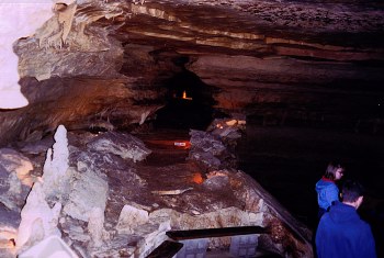 Before entering the cavern, let's first look around at the cavern entrance. Geologists refer to this area as a sinkhole. At one time, this was the largest and uppermost room of the cavern. Roughly 5,000 years ago, erosion from both above and below the ground weakened the ceiling to the point of collapse. The result is the depression you're standing in and the incredible 60 ft. Natural Bridge of limestone from which the cavern gets its name.