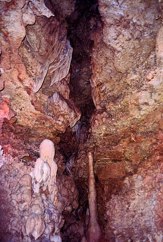 The Bear Pit is the first room of the caverns. It gets its name because explorers found an 8,000-year-old jawbone of a black bear here during the initial excavation. The remains of 45 other vertebrates were also discovered in the caverns. As you continue down the trail, to the lower right you will see Discovery Entrance. This narrow crawl way was once the only entrance to Natural Bridge Caverns. As you continue, you will pass through one of the three man-made passages blasted out of the rock to connect portions of the caverns.