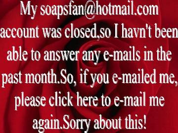 I  apologize  for  not  updating  in  the  last  few  days, but  since  my  computer  wasn't  working, I  had  no  way  of  working  on  my  websites  or  on  the  picture  calendar  I  promised  you. That  is  why  the  addition  of  the  Soapy  Picture  Calendar - which  will  be  updated  every  day  with  a  new  picture  from  the  soaps - will  have  to  be  postponed  untill  this  coming  weekend. So, to  make  it  up  to - if  anyone  here  has  been  waitig  for  this  calendar  a  long  time, please  e-mail  me  with  your  favorite  soap  or  soap  star, couple, etc.  and  I'll  be  sure  to  do  my  best  to  find  you  a  picture  of  your  fav  and  e-mail  it  to  you  by  the  end  of  this  week.