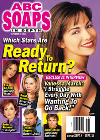 ![]() "I'VE LOVED SO MANY OF OUR COVERS. IN MY OPINION, THE BEST ONES ARE THOSE WITH A BIG RETURN, OR A BIG REVEAL. FOR INSTANCE, WHEN SONNY RETURNED TO GH WAS ONE OF MY FAVORITES. NEXT WEEK, WE HAVE THE EXCLUSIVE COVER STORY ON EVA LA RUE CALLAHAN'S [AMC'S EX-MARIA] RETURN TO AMC. FOR CBS, ONE OF MY FAVORITE COVERS WAS Y&R'S LAURALEE BELL (CHRISTINE) WITH HER BABY. IT WAS JUST SUCH AN HONEST AND INTIMATE INTERVIEW (AND, BY THE WAY, SHE'S JUST ANNOUNCED THAT SHE'S EXPECTING HER SECOND CHILD IN NOVEMBER!)"