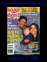Updates On The Website | News Flash | Soapy Stars | Soapy Interviews | Bring Back Our Favorite Soap Stars | Nominations and Awards - You Decide | Soapy Romance | Star Strucked | Soapy Birthdays | Soapy Magazines | Soapy Abbrevations | Soapy Addresses | Top 50 Soap Opera Sites | Site's Awards | Polls | Chat Room | Message Board | Links | Webrings | Banner Exchange | Guests Book | Credits | Contact Me