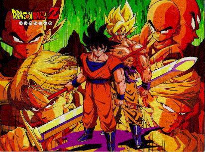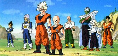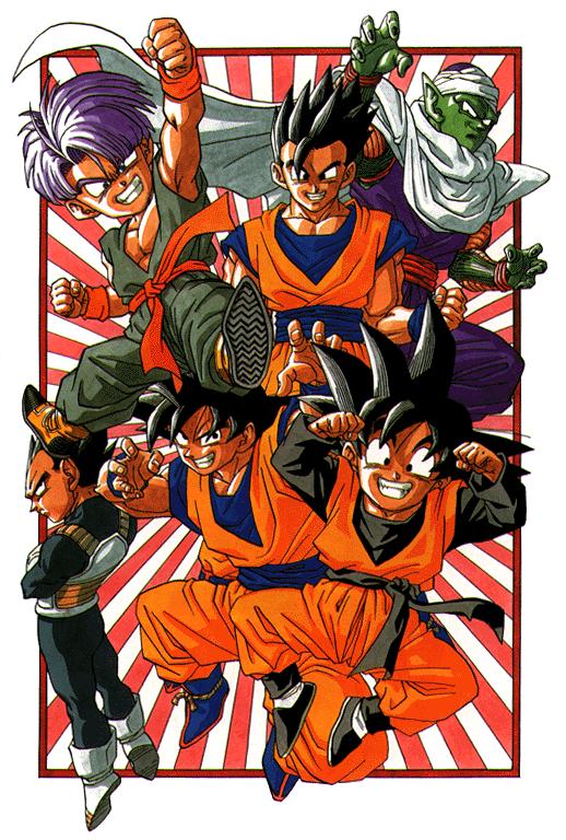 | Dragonball 54 | 30 kb | Cool pic of the Dragonball-Z cast posing for fights in a field |