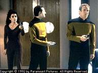 Oberfläche des Mondes eine Scannersuche verhindern, begeben sich Troi, Riker und Data mit