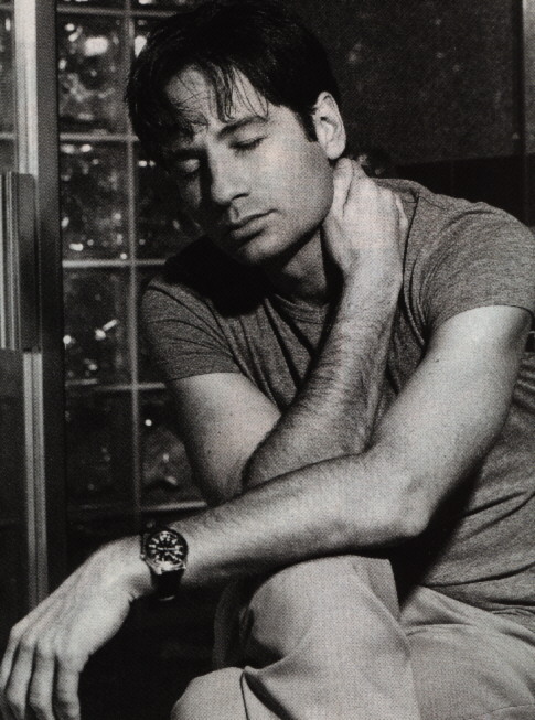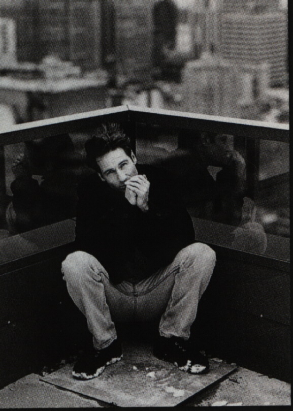 Duchovny thinks this over for a minute. "Perhaps is does. I saw this show on TV about how your happiness is sort of predetermined. It has nothing to do with you- you're either one of those people who looks on the bright side, or you're not. Just from looking at you, I can tell you're one of those really happy people, right? Me, I could convince myself all day that everything's really OK with the world, but I'd still feel blue. All in all, though. I'm not complaining."