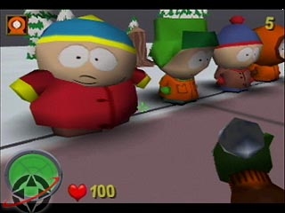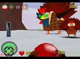 YES!!! South Park is coming to Nintendo 64! It will be a Doom style game and should be released around Christmas (USA). In single player mode, you can take on the roll of one of your favourite characters: Cartman, Stan, Kyle or Kenny. In multiplayer mode, you'll meet up with Big Gay Al, Mr Garrison, Officer Barbrady, Mephisto, Terrance and Phillip and more. Some of the weapons you'll encounter are: Cow Launcher, Auto Egger, Mr Hanky the Christmas Poo and a Fart Doll. The storyline? Every 666 years, a comet gets on a collision course with Earth wiping out every living thing. The problem is, prior to this event, the turkeys of South Park revolt and cause havoc destroying everything. Not only that, but the aliens have captured Cartman's mum and Scuzzlebutt has also gone lunatic. The single player game is based on six episodes and multiplayer modes include: Capture The Flag, Grudge Match and Kick The Baby. The 3D renderings in this game are brilliant as it uses a similar style game engine as Turok 2. Sounds especially made for the game uses advanced voice compression again similar to Turok 2.