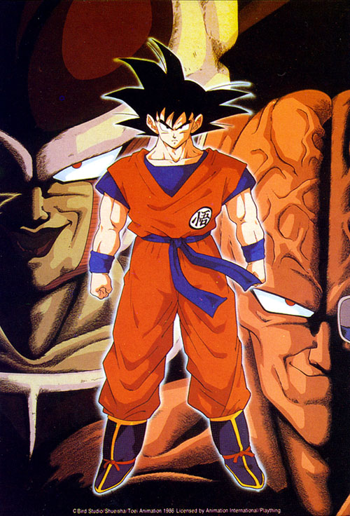 **Goku is the hero of Dragonball Z. He is a peaceful, good-natured, honest, trusting, and protective soul. He is also the most powerful warrior on Earth and the first to become a Super Saiyan in over 1000 years. Having honed his skills and strengthened his spirit to a level never achieved by any being on Earth, Goku is able to fly, shoot energy beams from his hands, move at incredible speeds and, when in a pinch, power-up to a fighting level so high it creates an energy aura around his body and makes him turn blond with green eyes... becoming in effect a walking nuclear war. Goku hasn't learned these skills just for fun, his life is forced down this path as he battles the evil Saiyans in the final battle to save the Earth.