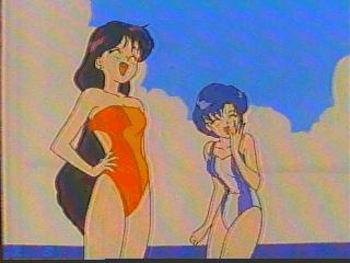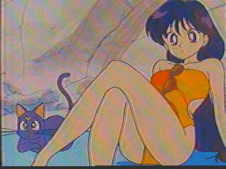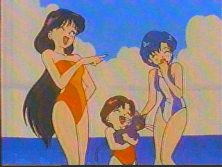 Rei in a swimsuit with Luna- I wonder what they're looking at?