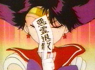 "Akuryou taisan" means "Evil spirits, begone!" Why did DIC change it so much for the US version? Nobody knows. This stuns the enemy, and Rei can also use it when she hasn't transformed into Sailor Mars.
