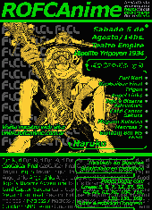 Hola Amiguitos!!! Somos el ROFCAnime Fansub y te escribimos para informarte que vamos a realizar nuestra 6ta fiesta el dia Sabado 5 de Agosto con motivo de nuestro primer aniversario!!! Vas a poder ver lo ultimo del Anime como el ultimo trabajo de GAINAX. Si!!! En exclusiva la primer OVA de FURI KURI. Ademas vas a poder ver: TRIGUN Ep1 ANGEL LINKS Ep1 GaoGaiGar Final OVA 1 CARD CAPTOR SAKURA Ep1 MEGAMI KOUHOSEI Ep 1 Jojo's Bizarre Adventure OVA1 (Las nuevas OVAs!) MACROSS 7 Ep 1 GUNDAM 8th MS Team OVA1. Y a demas, Sorteos y Sorpresas!!! Todo con calidad de DVD, hablado en Japones y subtitulado en Castellano. Imperdible, Pantalla GIGANTE, Butakas, Aire acondicionado. Entrada 5$ Venta de anticipadas en Camelot Comics Store (Corrientes y Montevideo). Sabado 5 de Agosto a las 14Hs en el Cine-Teatro Empire (Hipolito Yrigoyen 1934, a la vuelta del Congreso) Fijate en nuestra pagina la lista completa de Colectivos y Subtes que te dejan a menos de una cuadra! Te dejamos el afiche oficial para que te vayas babeando! Perú...