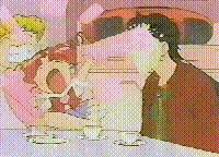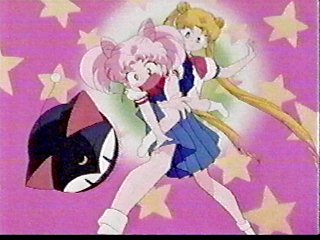 Usagi trying to hold Chibi Chibi back from tasting the pie of Seiya's face Anime