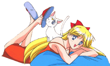 Minako in a dress on a blue pillow almost hitting Artemis with her foot! Anime, Transparent