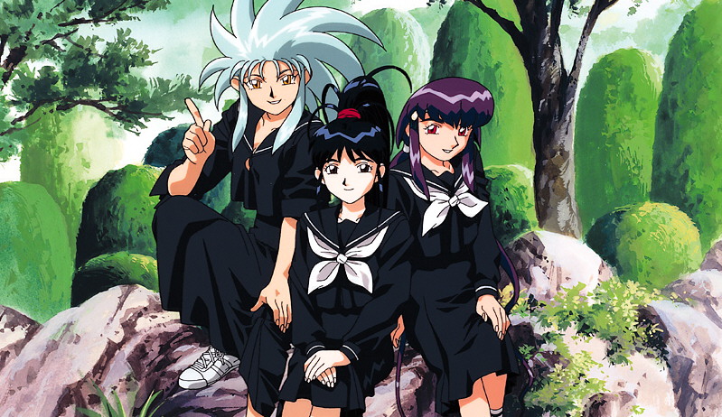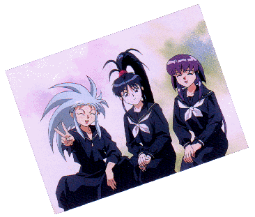 Ryoko, Achika, and Ayeka smiling in school uniform