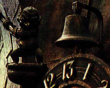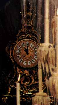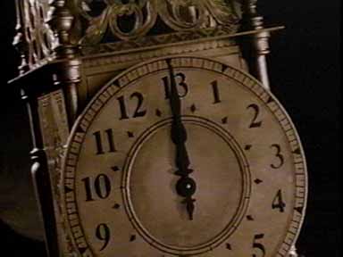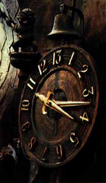 I've been giving too much thought to "How many hours are there in a Labyrinthian day?" While preparing this page, I flipped though LABYRINTH The Photo Album. I discovered pictures of no less than four different clocks with 13 hours on them! Then, the Grand Master of the Snappy, Stephanie Massick, pointed out that I had missed the clock in the final confrontation scene. I'm grateful to her for snapping it for me. Thanks, GMOS! Now, if I could just get my hands on one of those clocks...
