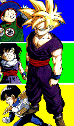 GOHAN: El hijo mayor de Goku, al principio cuando tiene 5 años es un mocoso lloron, cuando muere Goku es entrenado por Picoro, al que aprecia y respeta mucho, su primera pelea es contra Nappa y Vegeta a los que les hizo pasar un mal rato, viaja al planeta de origen de Picoro en donde se encuentra nuevamente con Vegeta, descubre a Freezer y sus gatos, crece dentro de mortales combates, pero luego se vuelve nerd, hasta que se aburre y decide entrar de super heroe pero lo descubre una mujer de la cual se enamora y llegan a tener una relación, es el Saiya Jin más poderoso de los no fusionables. |