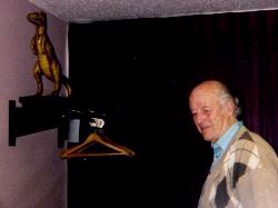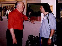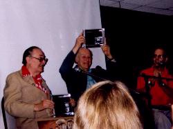 Ron Adams and staff must be thanked for a successfull convention that featured, amoung other things, a King Kong 65th Birthday bash. Ray Harryhausen and Forry Ackerman were on hand to share memories of King Kong and their own careers. They participated in 2 Q & A seesion together and each one held an individual session. We got a chance to discuss our web site, THE FANTASTIC FILMS OF RAY HARRYHAUSEN a bit with Ray, and were happy to hear that he's pleased with the progress and changes on the site. Ray and Forry were presented with plaques from the Bash Staff and Ray received a special bust of Kong. Forry was presented with a portrait of Lon Chaney and treated the audience with an accapella rendition of Marlene's Dietrich's FALLING IN LOVE AGAIN in German. We thanked Forry for the song and he treated us to another song about Aladdin (pictured below). Boyd Campbell presented a very interesting discussion on the "lost" scenes of Kong which included a slide presentation of the spider sequence and other footage removed from the film and believed to be lost forever.