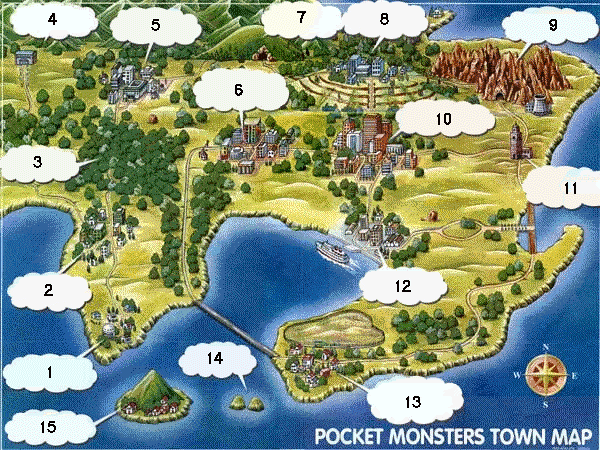11.Lavender Town 12.Vermillion City 13.Fuschia City 14.Seafoam Islands