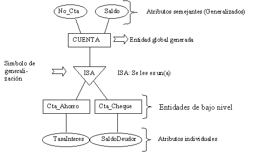 Podemos leer esta gráfica como: La entidad Cta_Ahorro hereda de la entidad CUENTA los atributos No_Cta y saldo, además del atributo de TasaInteres, de forma semejante Cta_cheque tiene los atributos de No_Cta, Saldo y SaldoDeudor.