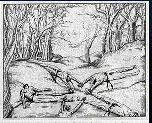 The gruesome fate of the first search party sent out to find Robin Weaver. This drawing, from McClory's Illustrated, shows one of the many differing accounts of how the men were found.