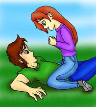 Ryo stood aside as he watched his friend get tackled. Before either of them knew it, Cye was laying in the grass on his back with a light skinned, red haired girl sitting on his chest. Before the boys could react, the intruder began talking up a whirl wind in an excited voice.