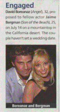 David Boreanaz (Angel), 32, proposed to fellow actor Jaime Bergman (Son of the Beach), 25, on July 14 on a mountaintop in the California desert. The couple haven't set a wedding date.