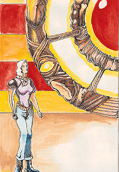 Shanine. He looked at the 3-D image, the only one he had left. The rest had been torn up in a fit of rage. She was smiling, despite the slate grey skies of a merciless February, her hair blowing in the breeze. She repeated the action 10 times as he turned the image this way and that until he could bear it no more. He felt a surge of electricity in his chest and closed his eyes. She was long gone now and he knew he should have forgotten her. After all, it had been two years and he knew the time should have come to move on but it would have been easier getting squeezed toothpaste back into the tube. The scanner winked a friendly green for 'safe' and he made arrangements to touch down on the orb's surface. Readouts indicated a small population with cities and high levels of smog. 'A little like Los Angeles,' he thought. The Cancun Star dropped through the clouds, retro rockets slowing its descent. There was a subtle hum emerging from his radio receiver and while organising the landing he decided to record the message and listen to it later. He caught something about "This is Grace...." and "...anger." but Murphy had picked up such transmissions in the past. They had turned out to be soundwaves. Usually old episodes of I Love Lucy. The traveller meant to check it out but like so much of the admin in his office back on earth, he mentally filed it and within seconds, forgot about the message completely. The brave pilot had heard rumours of the circle of chaos, but never believed it. Until a large rose of energy appeared from nowhere and engulfed the insect- like ship. The circle of screaming faces bloomed around him sending his readouts haywire and giving Murphy the most god-awful headache. It lasted barely three seconds and he wondered if anything had happened at all. Maybe the result of some odd gravitational force arrested his vision. A strange case of the galactic bends. "The COC's got him," Sixteen was adjusting her binocs, trying to get a better view. "I can't watch," her sister looked away. "What's happening?" "Well, probably the same thing as has happened to everyone else on this dustball. The COC'll absorb the pilot into it's energy field and we'll be alone." "If only someone could get through." "That ship really is a beaut. Flew one like that three years ago. Remember that pilot who slipped through the COC during a lightning storm? Took me up in his the once. We got to thirty thousand feet and he let me take the stick. Handles just like an F-14." "How do you know? You've never flown an F-14." "No, but I've seen Top Gun a 100 times." The Cancun Star was suddenly free of the energy field and burned through the atmosphere, skimming over the miles of desert that seemed to cover the planet. Murphy's head was still reeling from the anomaly, to the point where he wasn't sure what was real any more. And then, in the distance, he saw the edifice.