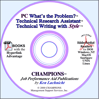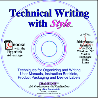 Second Edition How to write step-by-step procedure and troubleshooting support documentation for highly structured electronic and Internet distribution, product packaging, booklet and book publications. For the novice technical writer, it starts out with assistance in selecting words that best express a concept; then, provides assistance with punctuation and composition. It shows how best to assemble words into statements that almost anyone can read to understand precisely what your are communicating. For novice and professional writers, it provides a framework for writing complex technical documents that are interesting, sufficiently detailed, and if necessary in the least amount of space. Technical Writing with Style is the only source of information on such topics as creating new words, designing Job Performance Aids, and writing and designing product packaging and device labels. CHAMPIONS publications are designed as Job Performance Aids (JPAs)---tools to help people to do their jobs. The underlying concept is simple: you may be working in front of a customer, your boss may be looking over your shoulder, you only have one chance to do it right, and it has to be now. The JPA helps you to quickly assess any potential problem and locate a solution specifically tailored to it. The ideal is to do so within 30 seconds. Each solutions is presented in a step-by-step format that is easy to read and follow. And they do not presume significant prior knowledge as if answering this request: don't confuse me with the details, just tell me what to do. For JPAs, word selection is as unambiguous as possible; composition as simple as required for reading to a stranger over the phone. A JPA's text