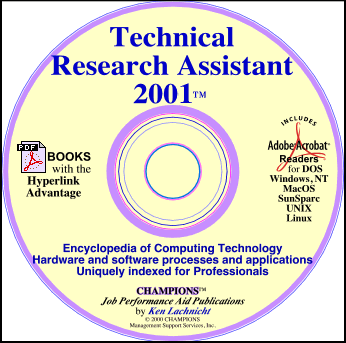 CHAMPIONS' publications can be read, searched and printed using Adobe's Acrobat Reader software. Each CD includes Readers for DOS, Windows, OS/2, Unix and MacOS. Each book is published in the Adobe Acrobat's Portable Document Format (.PDF). This is the standard format used for electronic publication and document exchange. It insures that the text and images on the pages will appear as originally created. It also supports hypertext links which make it easy to navigate within and among complex documents, send email, and connect with Internet sites. Using Acrobat Reader, you can easily change the viewing size of pages to make reading easy on different size screens. Another advantage of our page design is that it does not require the use of a mouse for navigation, although you may still use one for hyperlinks. First page, last page, next page, previous page require only a single keystroke. These considerations, plus the Reader's many search and navigation aids, should make your reading experience fruitful and enjoyable. Updates for each book will be published periodically and distributed via the Internet, as well as on CDs--whichever you may prefer. We know you will want to take advantage of this option to keep up to date with the latest developments in the computer and consumer electronic service industries. ![]()