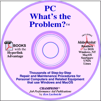 This publication covers personal computers and related equipment associated with DOS, Windows, OS/2, and the MacOS. PC What's the Problem? was originally created as a field manual for service technicians; but it now includes many procedures that should only be done in a service center, such as diagnosing and repairing high voltage circuits in CRT-based monitors. Designed as an aid to help technicians to do their job, but anyone responsible for maintaining business computers will find it indispensable. It covers all problems associated with maintaining business computers and the equipment connected to them; such as keyboards, modems, monitors, printers, networks, and so on. For this reason, it is also ideal for computer technician training classes. PC What's the Problem?'s Job Performance Aid (JPA) design can help technicians find solutions to problems within 30 seconds. Every possible cause of problems is explored---from the most likely to the least. Step-by-step solutions are presented in clear and unambiguous terms. Technical terms are defined in the sentences in which they are used to prevent confusion. Illustrations are provided, as needed, to enhance the technician's understanding of products and procedures. Hyperlinks make it easy to look up critical information in the many task-support tables; then quickly return to the procedure. Everything in the publication conforms to the JPA design; for example, each task-support table is fully explained and organized to present all of the information you will need---in the order you need it---to complete a procedure. PC What's the Problem? also supports System and Site Management. Its worksheet documentation system can be used to manage every aspect of computer installation, maintenance and repair from recording directions to a customer's site and the people there---all the way to network planning, installation and troubleshooting. Security is of particular importance to site management. This Job Performance Aid has a Security Policy Planning and Review System with: physical security reviews, hardware and software security planning, telecommunications and internet security, password protection, information encryption methods, information encryption problems, network encryption methods, password protection programs for network security, intruder response drill, disaster recovery without a plan, disaster recovery contingency planning, business facilities completely destroyed, virus infection symptoms and responses, etc. This publication, published this year, has 1,904 full-size pages of tightly formatted text and illustrations. It can be yours for less than the cost of an hour of service.