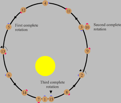 Titan. If an explorer were to step onto the surface of Mercury, he would discover a world resembling lunar terrain. Mercury's rolling, dust-covered hills have been eroded from the constant bombardment of meteorites. Fault-cliffs rise for several kilometers in height and extend for hundreds of kilometers. Craters dot the surface. The explorer would notice that the Sun appears two and a half times larger than on Earth; however, the sky is always black because Mercury has virtually no atmosphere to cause scattering of light. As the explorer gazes out into space, he might see two bright stars. One appearing as cream colored Venus and the other as blue colored Earth. Until Mariner 10, little was known about Mercury because of the difficulty in observing it from Earth telescopes. At maximum elongation it is only 28 degrees from the Sun as seen from Earth. Because of this, it can only be viewed during daylight hours or just prior to sunrise or after sunset. When observed at dawn or dusk, Mercury is so low on the horizon that the light must pass through 10 times the amount of Earth's atmosphere than it would if Mercury was directly overhead. During the 1880's, Giovanni Schiaparelli drew a sketch showing faint features on Mercury. He determined that Mercury must be tidally locked to the Sun, just as the Moon is tidally locked to Earth. In 1962, radio astronomers looked at radio emissions from Mercury and determined that the dark side was too warm to be tidally locked. It was expected to be much colder if it always faced away from the Sun. In 1965, Pettengill and Dyce determined Mercury's period of rotation to be 59 +- 5 days based upon radar observations. Later in 1971, Goldstein refined the rotation period to be 58.65 +- 0.25 days using radar observations. After close observation by the Mariner 10 spacecraft, the period was determined to be 58.646 +- 0.005 days. Although Mercury is not tidally locked to the Sun, its rotational period is tidally coupled to its orbital period. Mercury rotates one and a half times during each orbit. Because of this 3:2 resonance, a day on Mercury (sun rise to sun rise) is 176 Earth days long as shown by the following diagram.