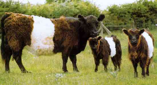 Belted Galloway cow 'Petronella' with her twins, 'Sash and Splash'