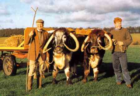 vital in many developing countries. We have trained oxen at the Cotswold Farm Park for nearly twenty years and have used Welsh Blacks, Longhorns, Gloucesters, White Parks and even Highlands. We currently have a pair of Longhorn oxen, "Philip and Edward" weighing just under 1 tonne each and a young pair who are not yet fully grown. The 'boys' are used regularly for set dressings in period films which have included; Precious Bane, Robin Hood, Merlin, Monty Python and the Time Bandits, Princess Caraboo, and Mel Gibson's Brave Heart. They have even pulled a wedding coach. |