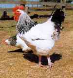 their egg production, as well as their good looks. Dark BRAHMA were imported into New York in 1846 from the area around the Brahma-Pootra river in India and first appeared in Britain in 1853. They have nicely tinted eggs and are classified as a heavy breed with a pea comb. In the 1950's Buff COCHINS were first imported from China and were first imported frm China and were known as the Cochin-China. They were very popular because of their great size and good laying ability although sadly they have been selected recently more for their fluffy leg feathers, which are popular in the show ring, than their utility characteristics. The SCOTS DUMPY is related to the Scots Grey, which is another traditional barnyard breed. The Dumpys have a standard size body and a very short leg. Birds of this type have been known in Scotland since 1678, but by 1975 they were almost extinct. Fertile eggs were reimported from a flock located in Zimbabwe, after the owners saw a TV programme about the Cotswold Farm Park. |