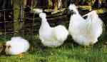 most attractive of our breeds. SILVER SPANGLED HAMBURGS originated in Northern Europe but the spangled variety was developed in Yorkshire and Lancashire 300 years ago. They were excellent egg producers but like many bantam breeds were sadly selected for the show ring, losing much of their laying ability along the way. Originating in Japan the Black Tailed White JAPANESE are another true bantam breed of great antiquity. They are the shortest legged of all the bantams and the Black Tailed Whites are most striking with thrie snow white bodies, black tails and necks and yellow legs. White-Crested Black POLANDs were first shown in London in 1845 but are believed to have originated from Poland and are probably descended from the ancient Paduan or Patavinian Fowl. |