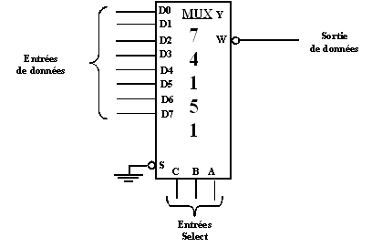 C’est un circuit logique ayant 8 entrées de données mais une seule sortie qui communique ces données. L’aiguillage de l’entrée de données qui nous intéresse sur la sortie est commandé par les entrées "select" appelées parfois "entrées d’adresses".