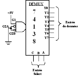 C’est un circuit qui possède 8 sorties mais une seule entrée. Lorsqu’une sortie est sélectionnée, il y transfert la donnée d’entrée qui est ici un niveau logique 0.