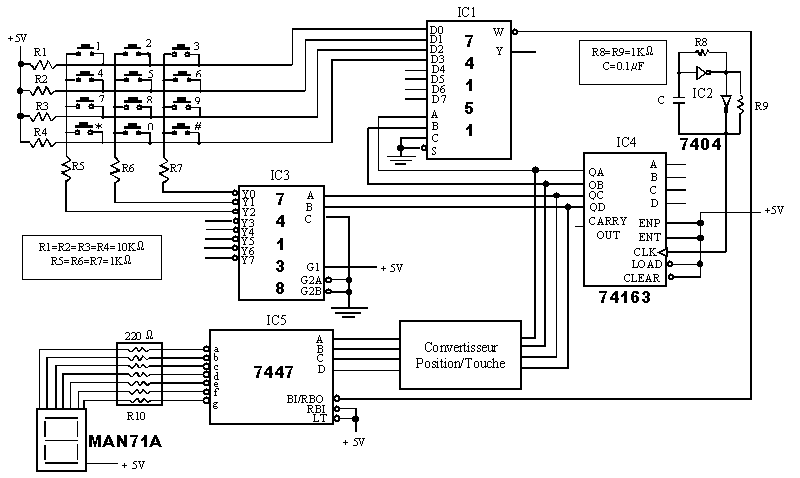 Le décodage d’un clavier de type XY : le circuit complet de cette interface qui sera vue en laboratoire comprend principalement une horloge, un compteur, un multiplexeur, un dé multiplexeur et un décodeur.