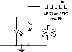 SEN1 et SEN2 (broches 9 et 10 du µC) : un optocoupleur à l’aide d’une roue rotative dentée envoie des impulsions au microprocesseur pour l’informer que les lecteurs 1 et 2 sont en fonctionnement. Si la roue dentée arrête de tourner (courroie coupée, mécanique bloquée), le microprocesseur arrête la platine à l’origine de la panne.