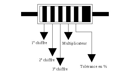 b) La valeur ohmique de la résistance fixe est codée numériquement sur le boîtier et s'interprète de la façon suivante : les deux premiers chiffres sont significatifs et le troisième chiffre indique le nombre de zéros à ajouter à ces chiffres significatifs. Par exemple :