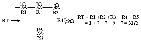 = [(R5 + R6) // R4 // (R2 + R3)] + R1 = (20 // 10 // 20) + 5 = 5 + 5 = 10 W