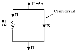 Le courant dans la résistance R1 est la somme de I’1 et I"1 soit I1 = I’1 + I"1 = 0 + 5 = 5 A